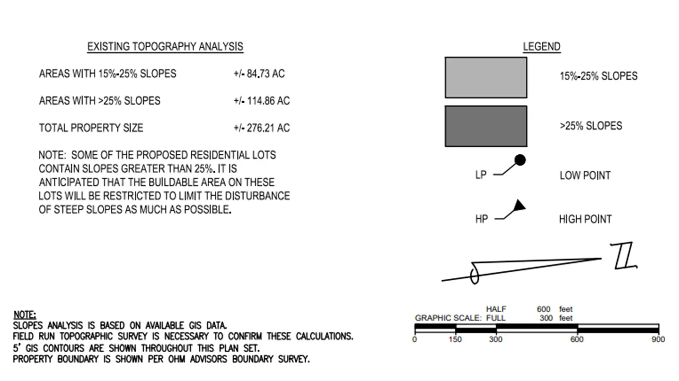 The site also includes significant natural slopes, which will limit where homes can be built and help preserve portions of the terrain. As shown in the map below, darker shaded areas indicate slopes greater than 25%.